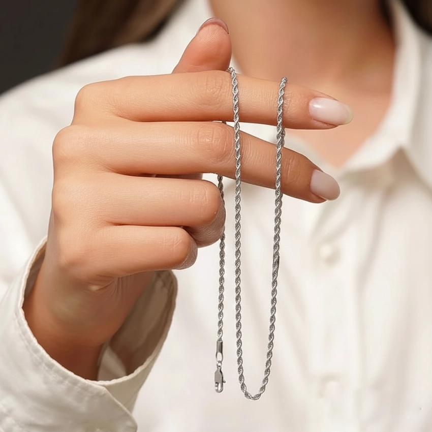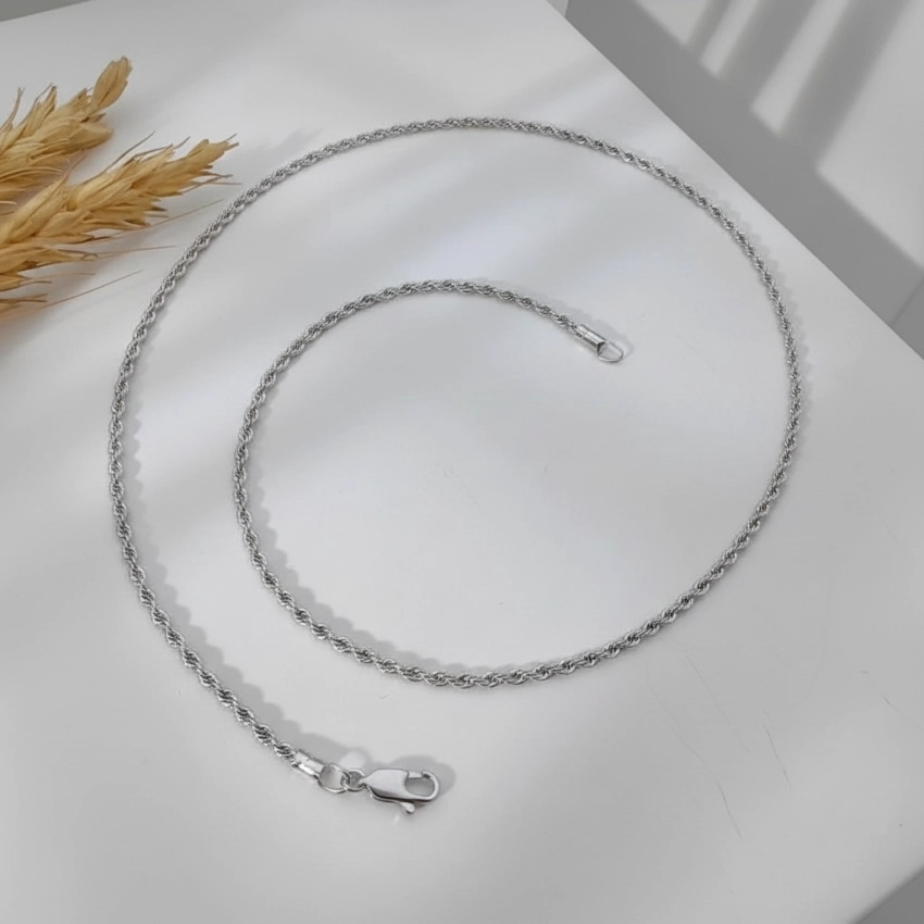 این زنجیر با طراحی طنابی و کلاسیک خود، مناسب برای استفاده در انواع استایل‌ها از رسمی تا روزمره می‌باشد. می‌توانید آن را به تنهایی یا همراه با پلاک‌های مختلف استفاده کنید.