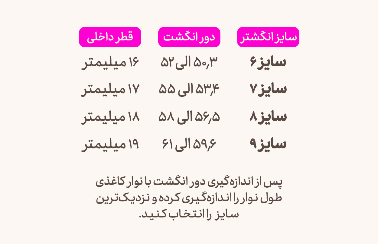 اگر قطر داخلی رکاب انگشترتون 16 میلیمتر باشه میشه سایز (6) ، اگر 17 میلیمتر باشه میشه (7) ، اگر 18 میلیمتر باشه میشه (8) و اگر 19 میلیمتر باشه میشه (9)