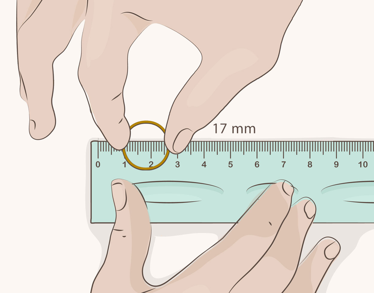 انگشتر رو مطابق تصویر روی سمتی از خطکش بذارید که میلیمتر داره (سمتی که خطهای بیشتری داره) بصورتی که خطوط و اعداد دقیقا وسط حلقه قرار بگیره، در این حالت، فقط فضای خالی وسط رکاب رو اندازهگیری کنید (ضخامت فلز رکاب رو درنظر نگیرید)
